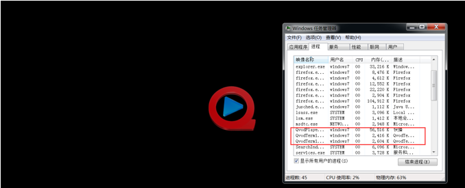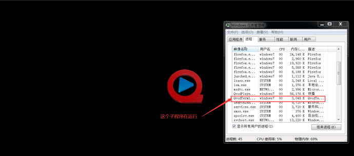 打开快播应用程序,查看当主程序运行时有无子程序在运行