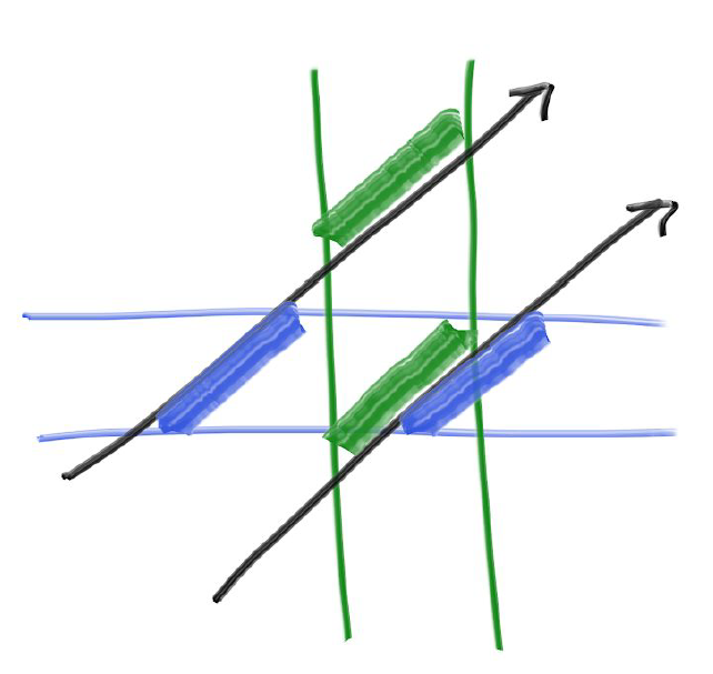 将一维数学转化为命中测试的关键观察是,对于命中,t间隔需要重叠。例如,在2D中,绿色和蓝色的重叠只有在撞击时才会发生: