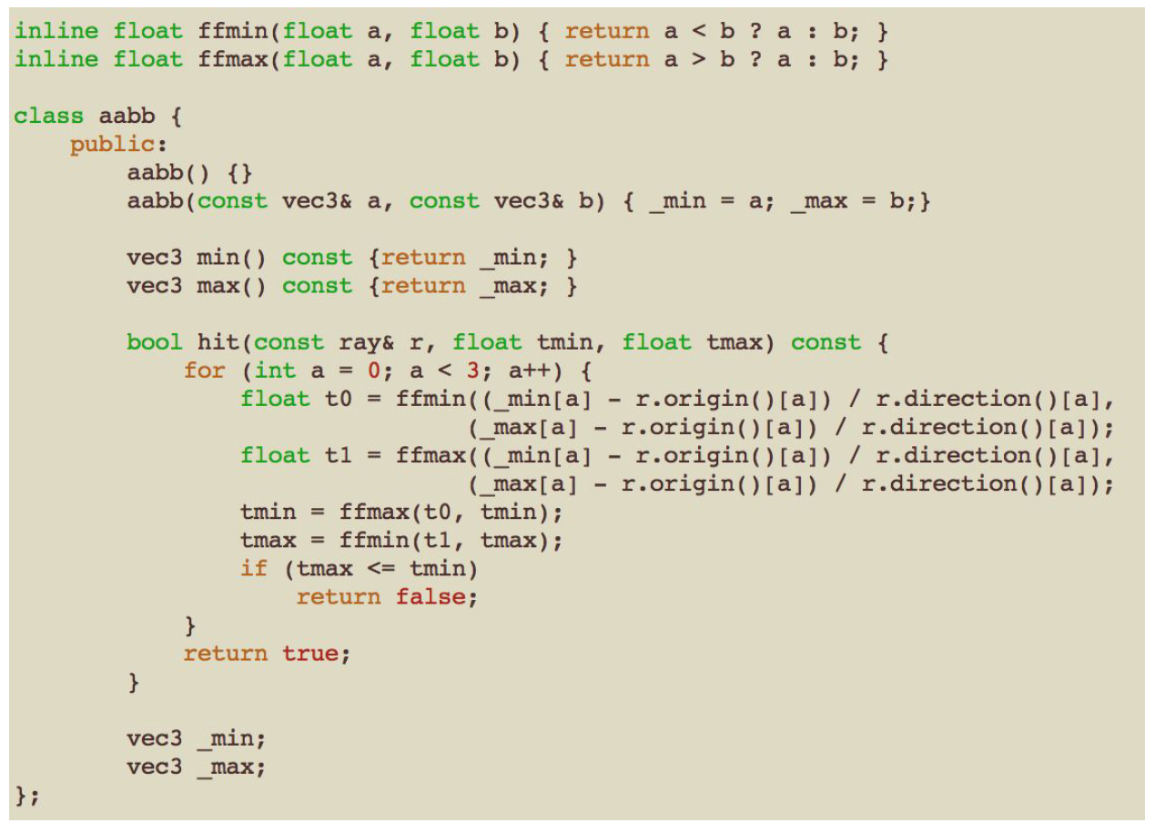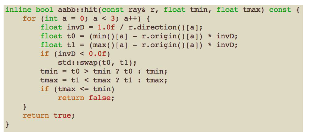 如果有任何一个NaN在那里运行,比较将返回false,因此我们需要确保我们的边界框中有一个小的填充,如果我们关心放牧情况(我们可能应该这样做,因为在射线跟踪器中所有的情况最终都会出现)。在一个循环中,三个维度同时在间隔tmin内传递,我们得到:、