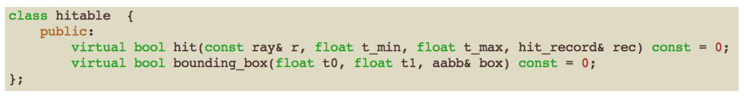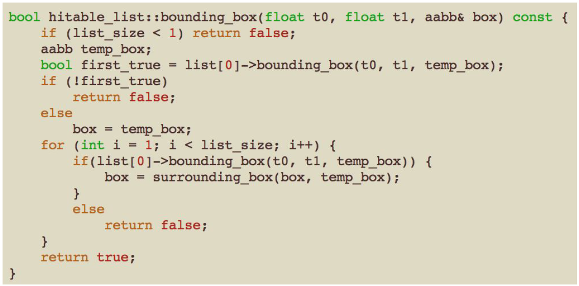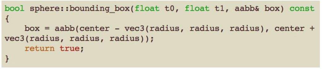 我们现在需要添加一个函数来计算所有hitable的边界框。 然后我们将在所有图元上创建一个框的层次结构,并且各个图元(如球体)将存在于各个叶子上。 该函数返回bool,因为并非所有图元都具有边界框(例如,无限平面)。 此外,对象移动,因此帧的间隔需要time1和time2,并且边界框将绑定在该间隔内移动的对象。