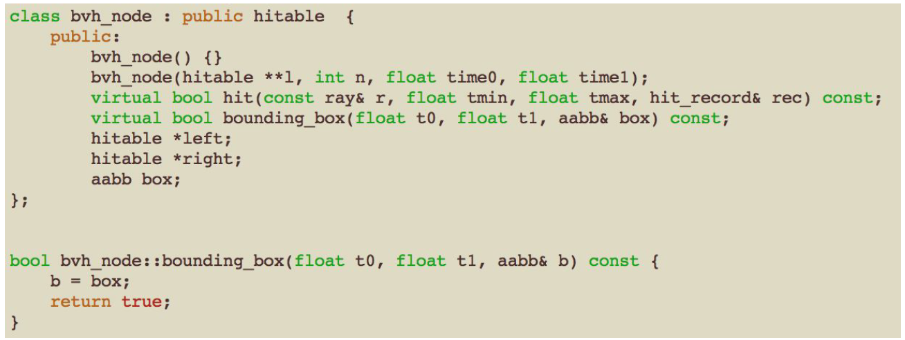 BVH也将成为一个可继承的 - 就像hitable列表一样。 它实际上是一个容器,但它可以响应查询“这条光线击中了你吗?”。 一个设计问题是我们是否有两个类,一个用于树,一个用于树中的节点; 或者我们只有一个类,并且根只是我们指向的节点。 在可行的情况下,我是一流设计的粉丝。 所以这是一个类: