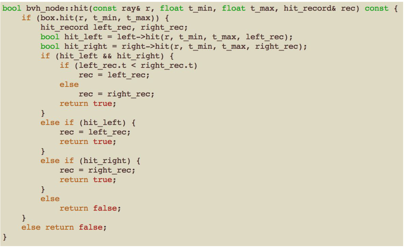 对一组图元的边界体的关键思想是找到一个完全包围(边界)所有对象的边界体。 例如,假设您计算了包含10个对象的边界球体。 任何错过边界球体的射线肯定会错过所有十个物体。 如果射线击中了边界球体,那么它可能会击中十个物体中的一个(也可能什么都没击中,考虑到边界体和它所包围的对象必然存在缝隙)。 所以边界代码总是以下形式: