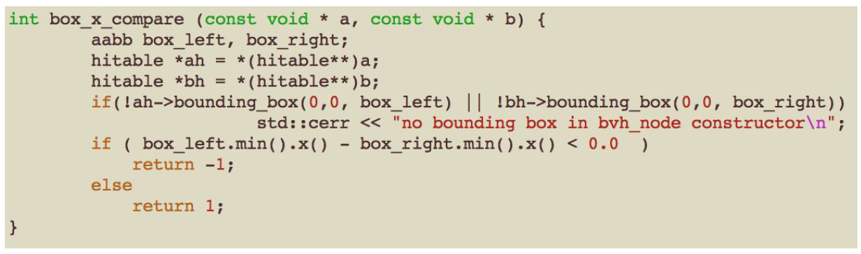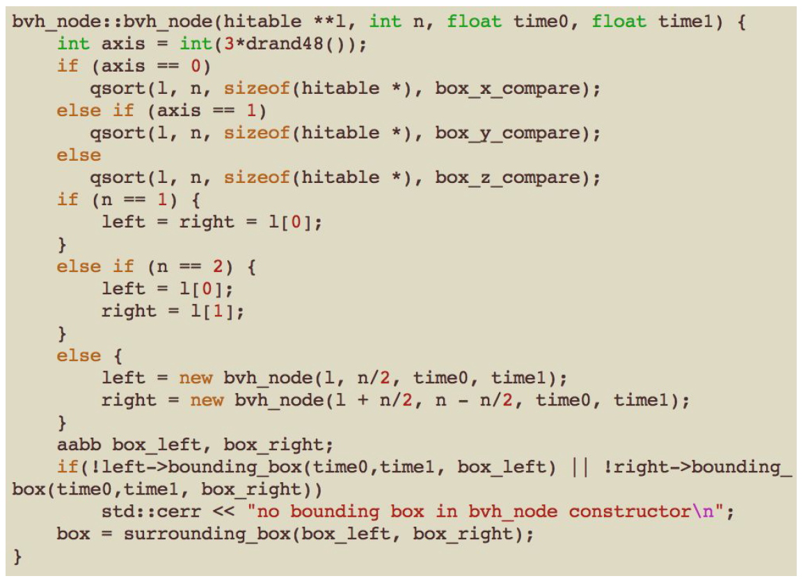 任何效率结构中最复杂的部分,包括BVH,都是构建它。我们在构造函数中这样做。BVH的一个好处是,只要bvh_node中的对象列表被划分为两个子列表,hit函数就可以工作。如果分割做得很好,那么它将会工作得最好,这样两个子节点的边界框就会比他们父母的边界框小,但这是为了速度而不是正确性。我将选择中间地带,在每个节点上沿着一个轴分割列表。我将为简单起见: