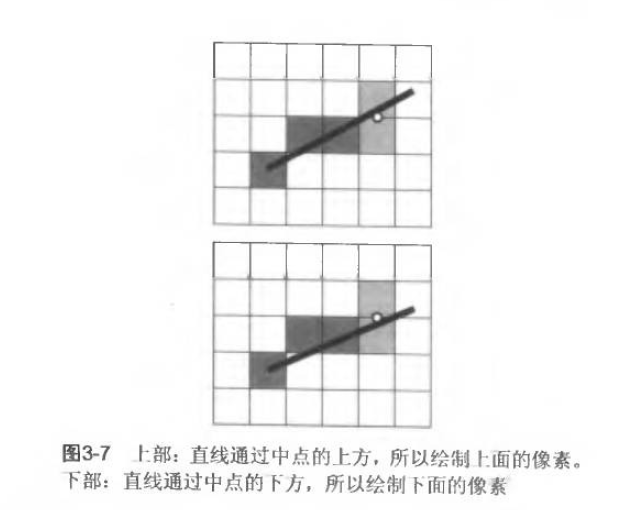 中点算法:如果直线通过中点的下方,就绘制下方的像素;如果直线通过中点的上方,就绘制上方的像素。