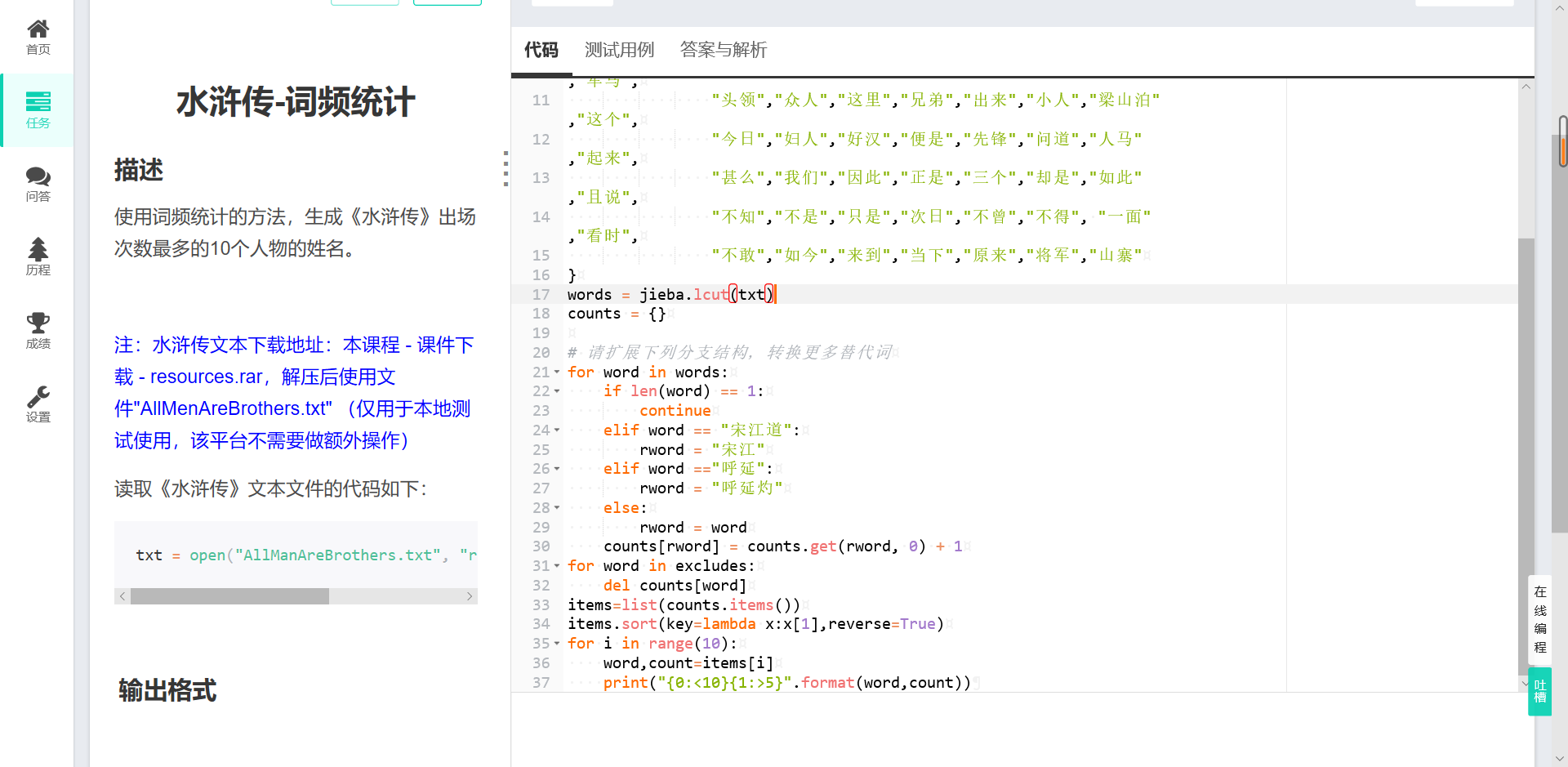 使用词频统计的方法,生成《水浒传》出场次数最多的10个人物的姓名。