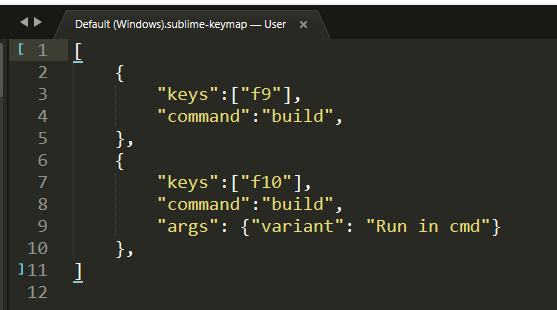 Preferences -> Key Bindings,删除右侧文档里的东西,复制以下代码,作用是F9编译,F10编译+运行