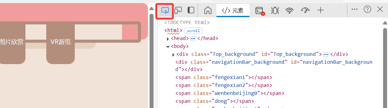 (本人使用的是Edge浏览器,每个浏览器提供的功能和界面可能不尽相同)可以点击“在页面中选择一个元素进行检查”按钮,查看页面内某一元素的代码: