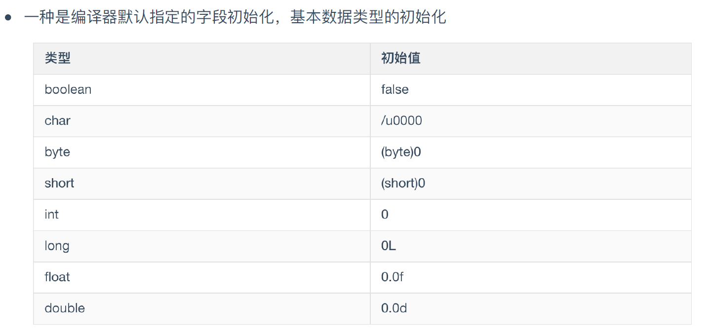 - 类初始化,String也是一个类,初始化是null。下图为成员的默认初始化。初始化也可以使用构造器初始化。
