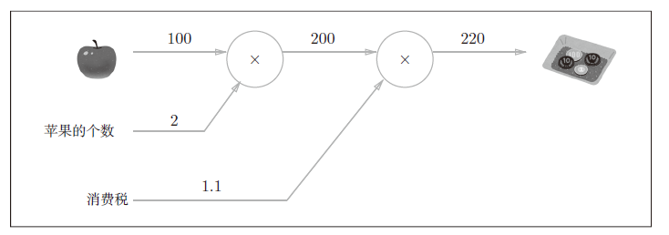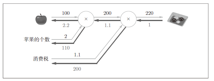 如前所述,乘法节点的反向传播会将输入信号翻转后传给下游。从上图可知,苹果的价格的导数是2.2,苹果的个数的导数是110,消费税的导数是200。这可以解释为,如果消费税和苹果的价格增加相同的值,则消费税将对最终价格产生200 倍大小的影响,苹果的价格将产生2.2 倍大小的影响。不过,因为这个例子中消费税和苹果的价格的量纲不同,所以才形成了这样的结果(消费税的1 是100%,苹果的价格的1 是1 日元)。