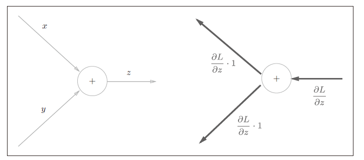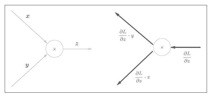 对于以乘法构成的神经网络,方向传播的直观理解就是求偏导数。若是两输入的,则是交换传递参数。对于多输入则按到链式法则来依次求偏导即可