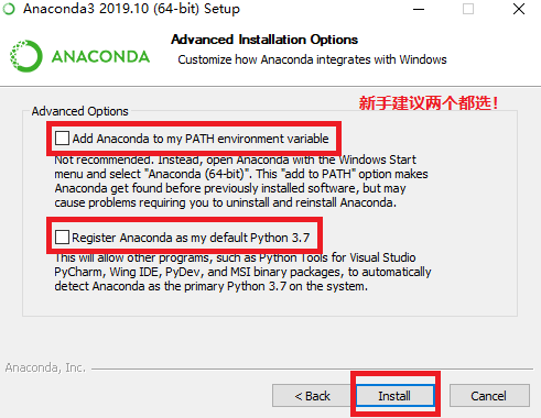 新手建议两个都选,尤其是第一个添加到环境变量,不然后面使用Anaconda Navigator会有点麻烦。