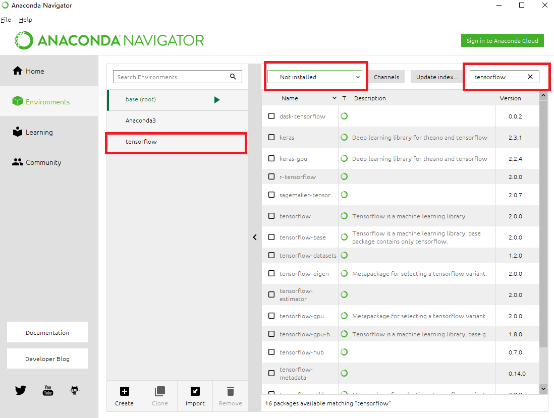 点击“tensorflow”,选择“Not installed”,搜索“tensorflow”。