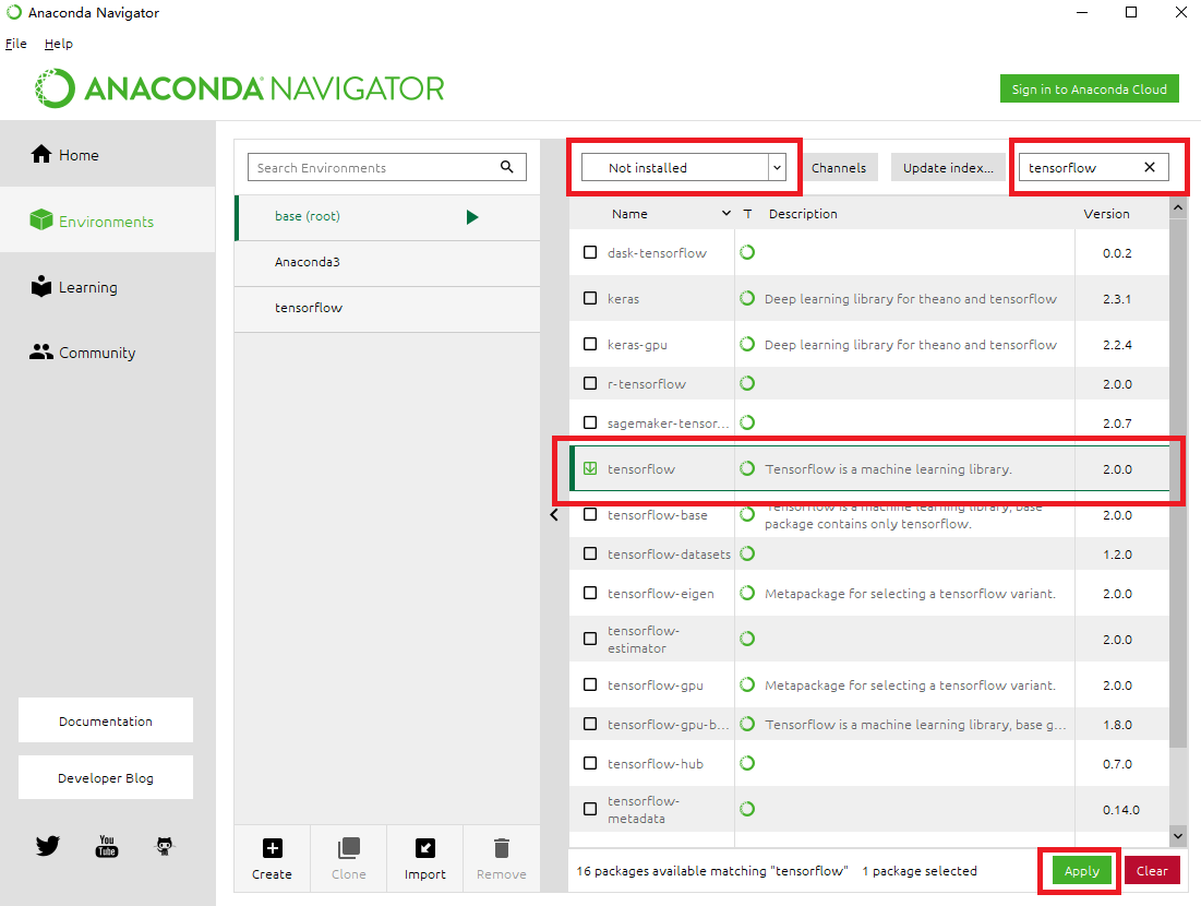 点击“tensorflow”前面的小框,然后点击“Apply”。