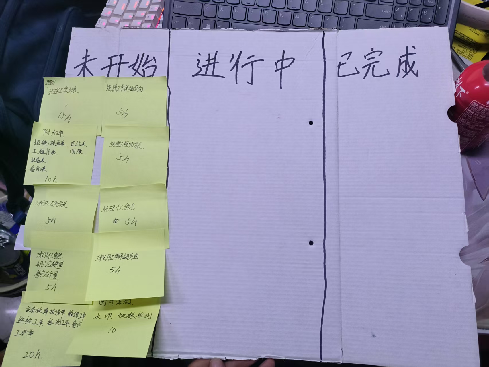 4月13日,TriBits项目组召开了团队项目计划会议,具体内容如下: 1.确定团队计划backlog,确定选题项目结构。 2.认领个人工作任务--刘宇恒和张一衡负责后端逻辑代码实现,张一衡和孙艺伟负责前端页面实现,团队博客由孙艺伟管理,并由孙艺伟负责记录每日站立会议。 3.每人对认领工作进行项目估算,规划所需要的时间。 4.制作任务索引卡以及团队任务看板,如图: 5.会议记录如图: