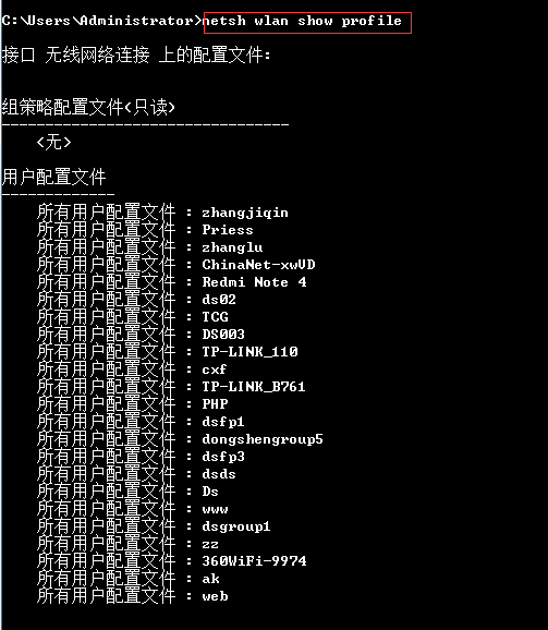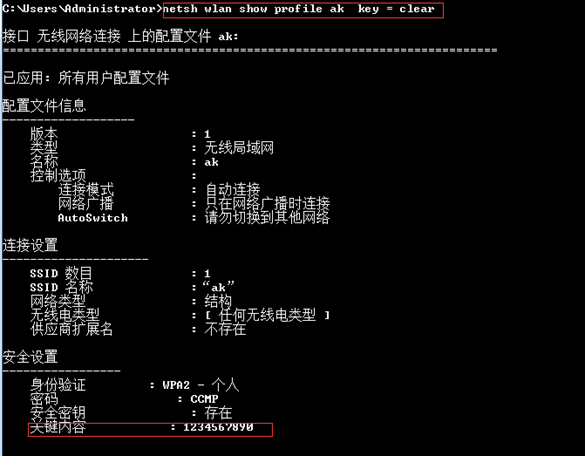 查看密码 netsh wlan show profile youname key = clear 在关键内容中就可以看到选择的WiFi密码
