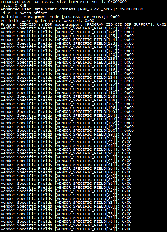 执行如下命令,可查询eMMC的EXT_CSD寄存器(扩展配置寄存器)内容。