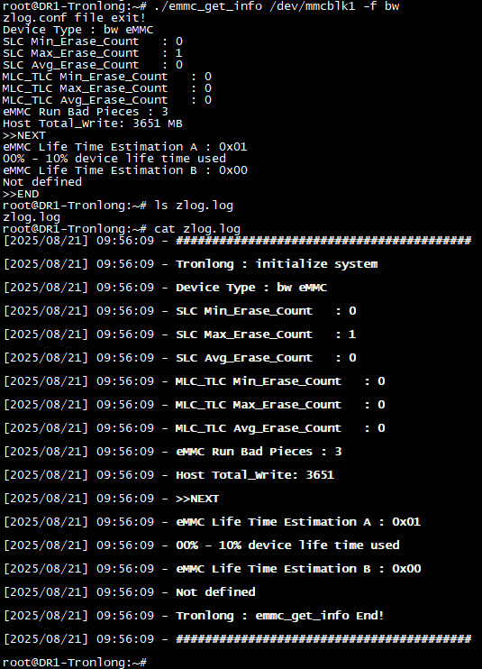 案例功能:通过向程序传入eMMC的设备节点路径、品牌等参数,实现读取eMMC内部健康管理信息的功能。该程序对获取的信息进行整理后打印输出,并同步记录日志,便于后续查阅。