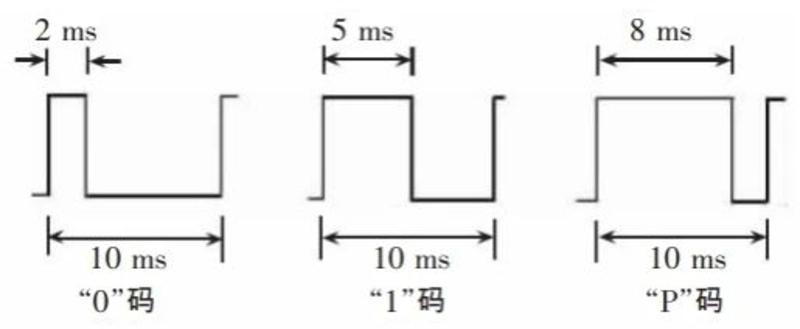 IRIG-B码为每秒一帧的时间串码,一帧串码中包含100个码元,频率为1KHz,即每个码元占用10ms时间。IRIG-B码基本的码元为"0"码元、"1"码元和"P"码元,"0"码元和"1"码元对应的脉冲宽度为2ms和5ms,"P"码元为位置码元,对应的脉冲宽度为8ms,IRIG-B码信息的基本码元的示意图如下所示。