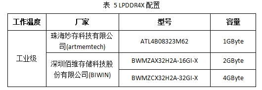 核心板通过CPU的专用LPDDR4X总线连接1片LPDDR4X,采用32bit数据线。LPDDR4X兼容型号有如下表所示,支持LPDDR4-2800工作模式(1400MHz)。