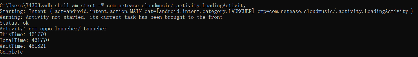 查看冷启动adb命令:adb shell am start -W com.netease.cloudmusic/.activity.LoadingActivity(app包名/ActivityName)