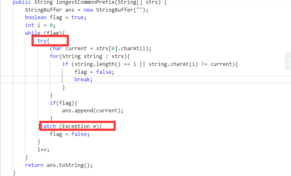 1. 解法一 垂直扫描法 对于有关字符串数组的题目,可以巧妙利用java的异常机制来处理多种边界情况