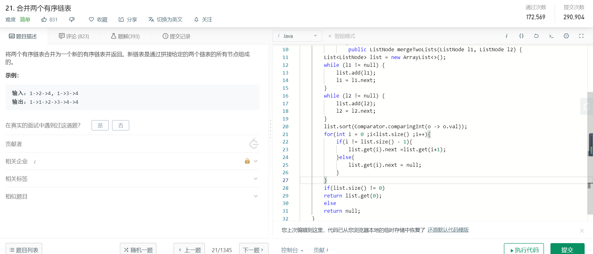1. 本人做法,采用了取巧的方法,利用了java的comparartor与自带的sort函数,先拆链表再构建链表,java还是好用啊
