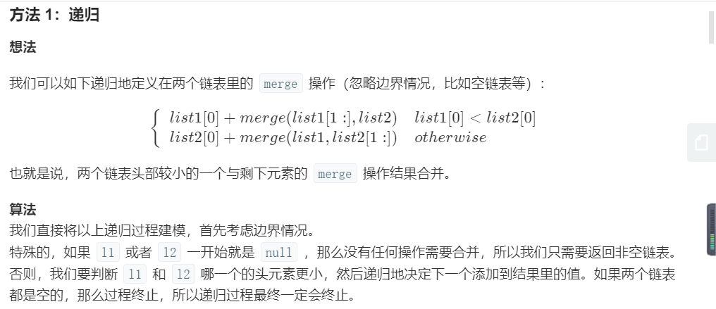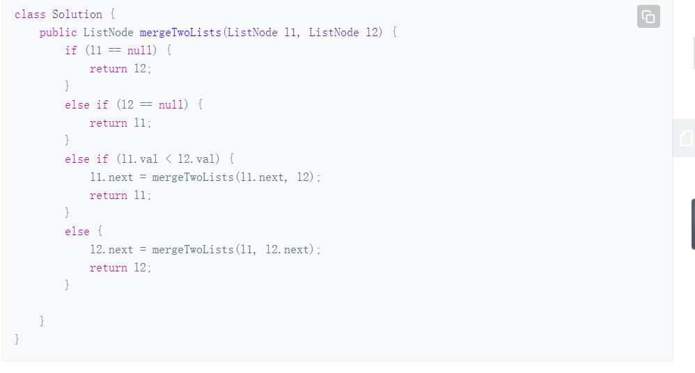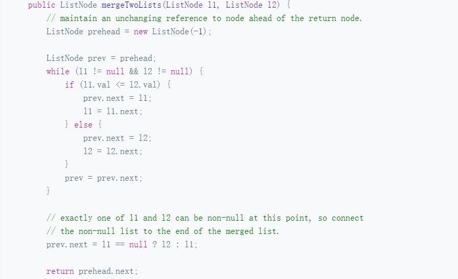 3. 迭代法(归并排序中的merge过程,逐个比较)这里最好创建一个新的链表,如果在原有的链表(l1或者l2上面操作的话会很麻烦)