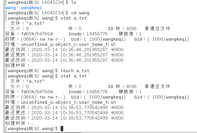 答:如果touch命令后的文件已经存在,则“touch”命令会修改已经存在的文件的相关时间属性(存取时间、更改时间等)。我们在创建的“ye”目录中,通过“stat a.txt”命令查看该文件的相关信息,再对其通过“touch”命令进行操作,然后再次通过“stat a.txt”命令查看该文件操作后的相关信息。
