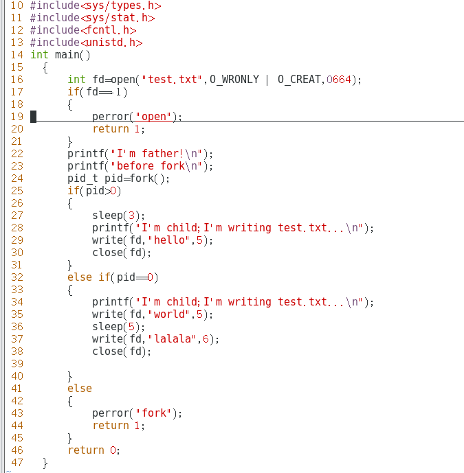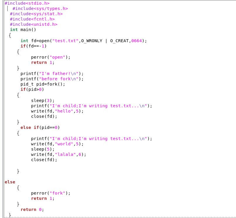 6.在 fork 之前以写的方式创建了一个文件 test.txt。然后 fork 出的子进程立即向文件中写入“world”,然后睡眠5秒。而父进程在 fork 后睡眠3秒后向 test.txt 写入 "hello",并关闭描述符。子进程恢复后,又向 test.txt 文件中写入 "lalala"后关闭描述符,结束。