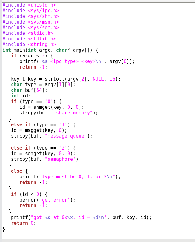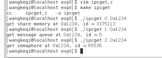 程序 ipcget 用于在指定的键值上获取 ipc 内核对象的 id 号。使用格式为 ./ipcget ,比如
