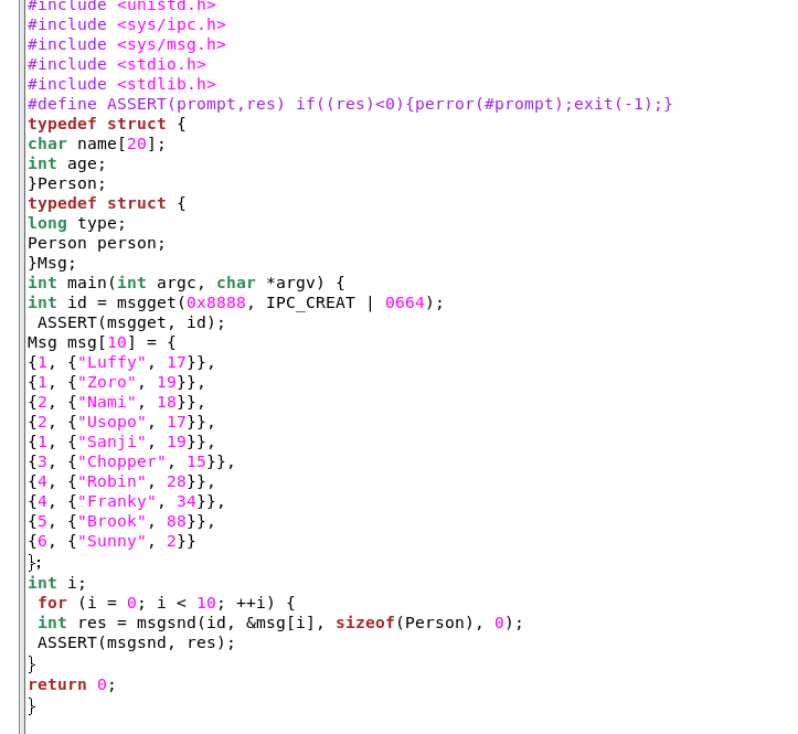 消息正文部分是结构体 Person 。该程序向消息队列发送了 10 条消息。