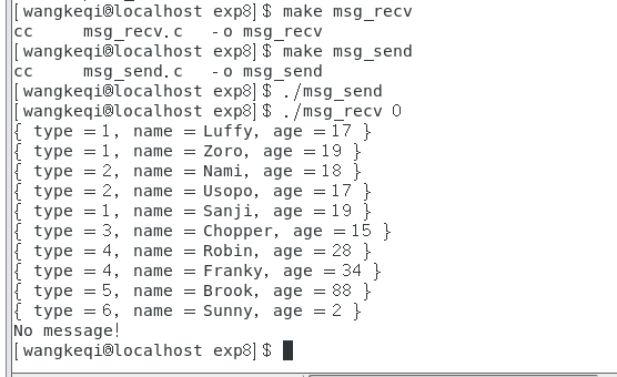 先运行 ./msg_send ,再运行 ./msg_recv 。