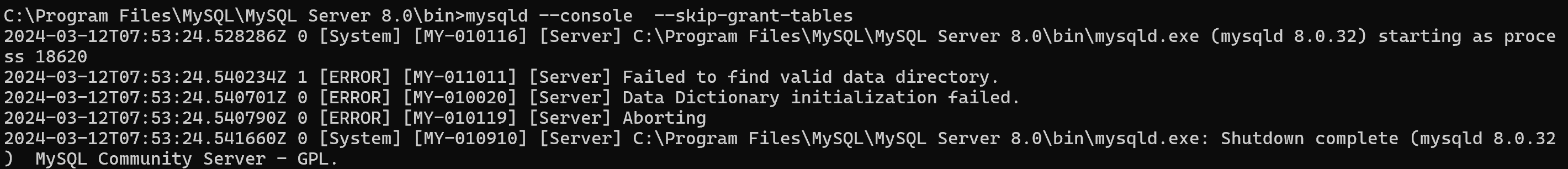 要加入数据目录地址,输入 .\mysqld --console --datadir="D:\Develop\MySQL\Data\Data" --skip-grant-tables --shared-memory