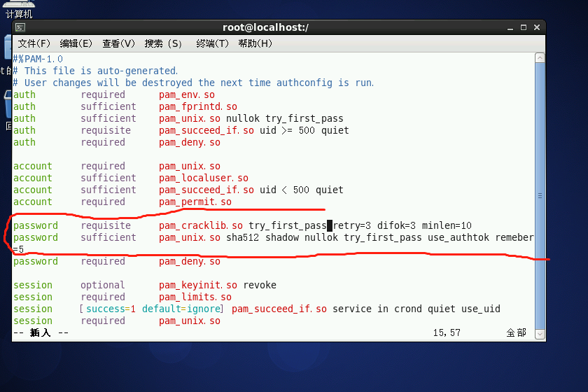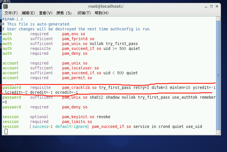 在同时有password和 pam_cracklib.so 将后面参数改为 retry=3 difok=3 mnlen=10