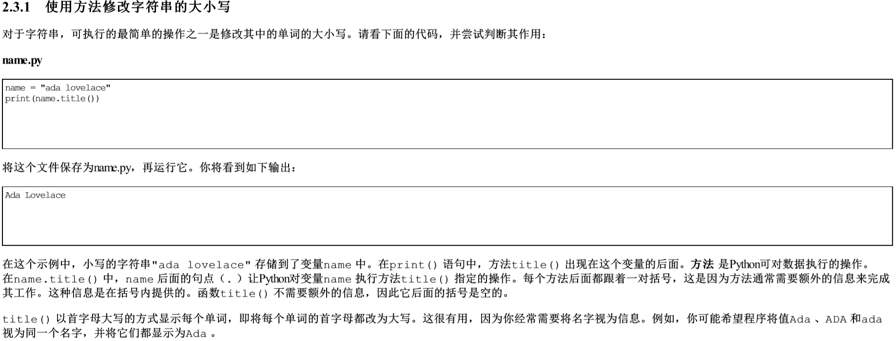 方法是python对数据执行的操作,name后面的(.)让python对变量name执行方法title()指定的操作。