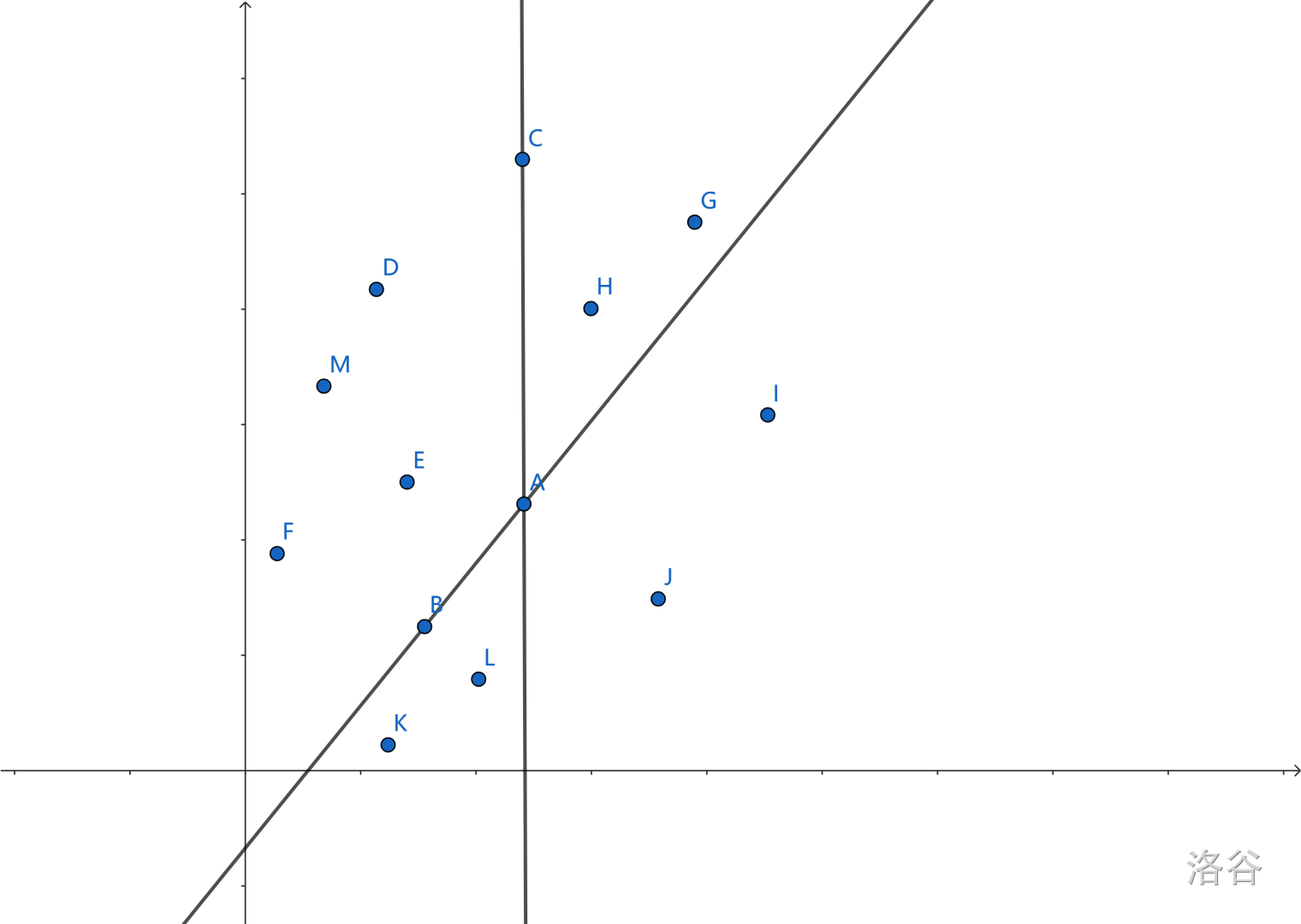 竖线是过 \(A\) 且平行于 \(y\) 轴的直线。若枚举到的点为 \(A\),那么会发现 \(A\) 与 \(B,G,H,K,L\) 所构成的直线的斜率要大于等于 \(mid\)。