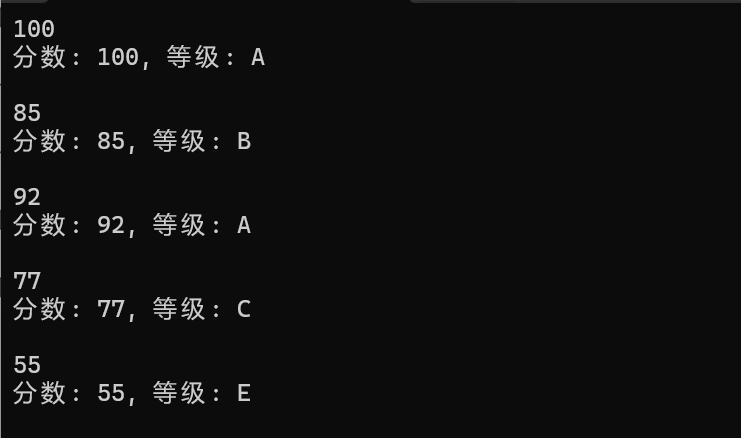 #include <stdio.h> char score_to_grade(int score); // 函数声明 int main() { int score; char grade; while(scanf("%d", &score) != EOF) { grade = score_to_grade(score); // 函数调用 printf("分数: %d, 等级: %c\n\n", score, grade); } return 0; } // 函数定义 char score_to_grade(int score) { char ans; switch(score/10) { case 10: case 9: ans = 'A'; break; case 8: ans = 'B'; break; case 7: ans = 'C'; break; case 6: ans = 'D'; break; default: ans = 'E'; } return ans; }