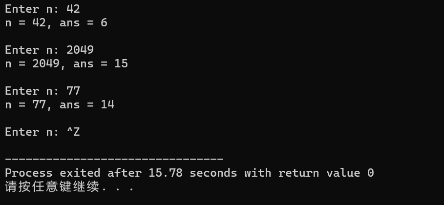 #include <stdio.h> int sum_digits(int n); // 函数声明 int main() { int n; int ans; while(printf("Enter n: "), scanf("%d", &n) != EOF) { ans = sum_digits(n); // 函数调用 printf("n = %d, ans = %d\n\n", n, ans); } return 0; } // 函数定义 int sum_digits(int n) { int ans = 0; while(n != 0) { ans += n % 10; n /= 10; } return ans; }