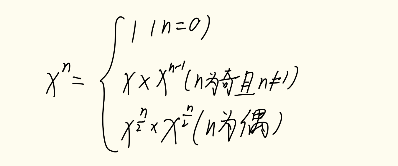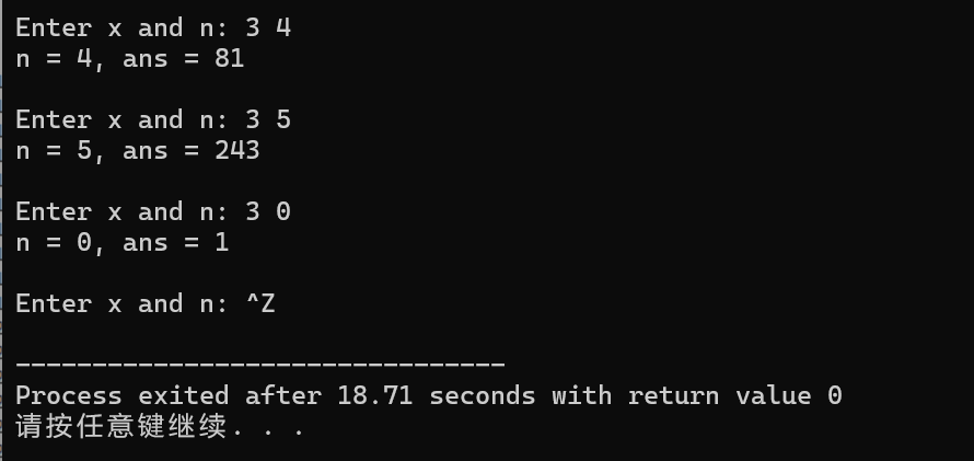 #include <stdio.h> int power(int x, int n); // 函数声明 int main() { int x, n; int ans; while(printf("Enter x and n: "), scanf("%d%d", &x, &n) != EOF) { ans = power(x, n); // 函数调用 printf("n = %d, ans = %d\n\n", n, ans); } return 0; } // 函数定义 int power(int x, int n) { int t; if(n == 0) return 1; else if(n % 2) return x * power(x, n-1); else { t = power(x, n/2); return t*t; } }