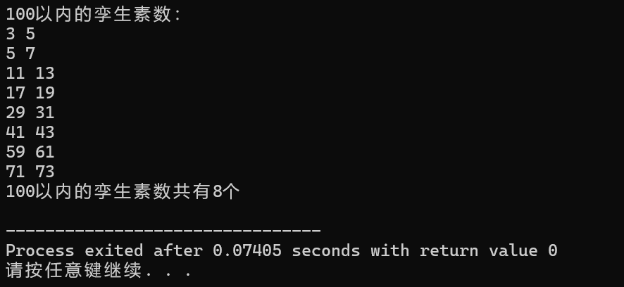 #include<stdio.h> int is_prime(int i); int main() { int i, sum = 0; printf("100以内的孪生素数:\n"); for(i = 3; i + 2 <= 100; i = i + 2) { if(is_prime(i) && is_prime(i + 2)) { printf("%d %d\n", i, i + 2); sum = sum + 1; } } printf("100以内的孪生素数共有%d个\n", sum); return 0; } int is_prime(int i) { int n; if(i <= 1) return 0; for(n = 2; n * n <= i; ++n) { if(i % n == 0) return 0; } return 1; }