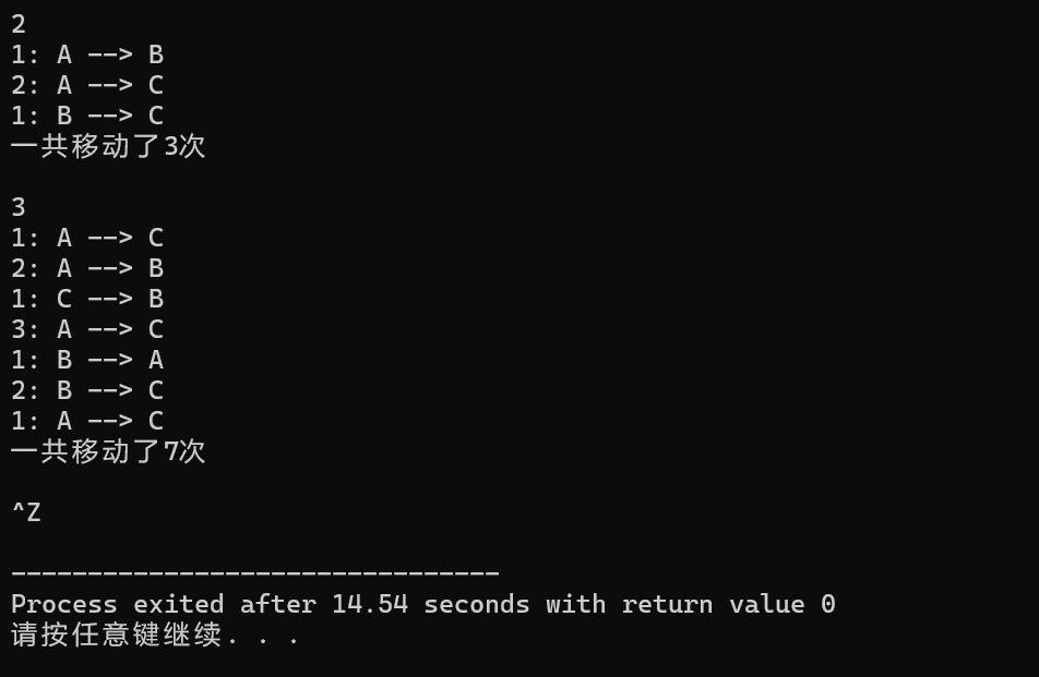 #include <stdio.h> int count = 0; void hanoi(int n, char from, char mid, char to); int main() { int n; while (scanf("%d", &n) != EOF) { count = 0; hanoi(n, 'A', 'B', 'C'); printf("一共移动了%d次\n\n", count); } return 0; } void hanoi(int n, char from, char mid, char to) { if (n == 1) { count++; printf("%d: %c --> %c\n", 1, from, to); } else { hanoi(n - 1, from, to, mid); count++; printf("%d: %c --> %c\n", n, from, to); hanoi(n - 1, mid, from, to); } }
