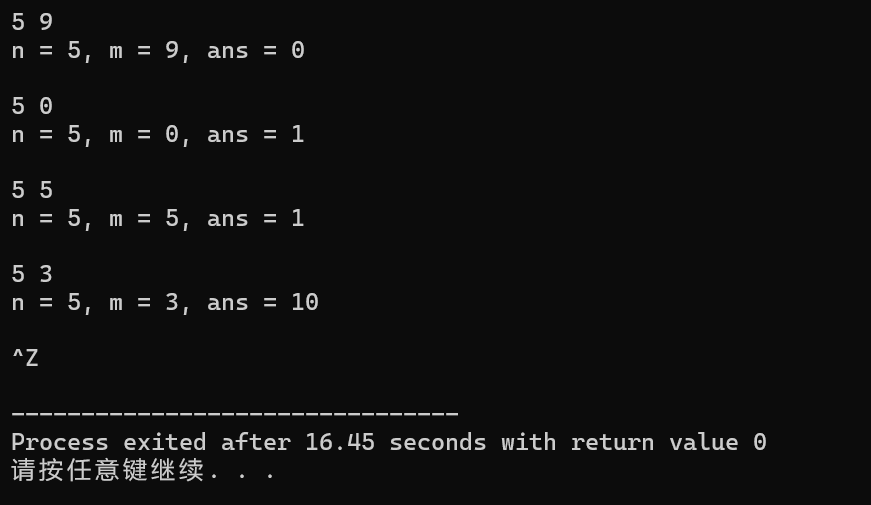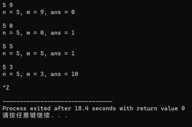 #include <stdio.h> int func(int n, int m); int main() { int n, m; int ans; while(scanf("%d%d", &n, &m) != EOF) { ans = func(n, m); printf("n = %d, m = %d, ans = %d\n\n", n, m, ans); } return 0; } int func(int n, int m) { if (m == 0 || m == n) return 1; if (m > n) return 0; return func(n-1, m) + func(n-1, m-1); }