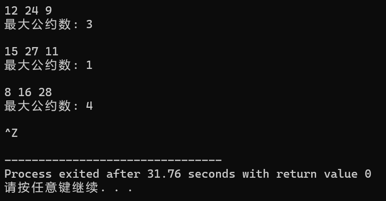 #include <stdio.h> int gcd(int a, int b, int c); int main() { int a, b, c; int ans; while(scanf("%d%d%d", &a, &b, &c) != EOF) { ans = gcd(a, b, c); printf("最大公约数: %d\n\n", ans); } return 0; } int gcd(int a, int b, int c) { int min = a; if (b < min) min = b; if (c < min) min = c; for (int i = min; i >= 1; --i) { if (a % i == 0 && b % i == 0 && c % i == 0) { return i; } } return 1; }
