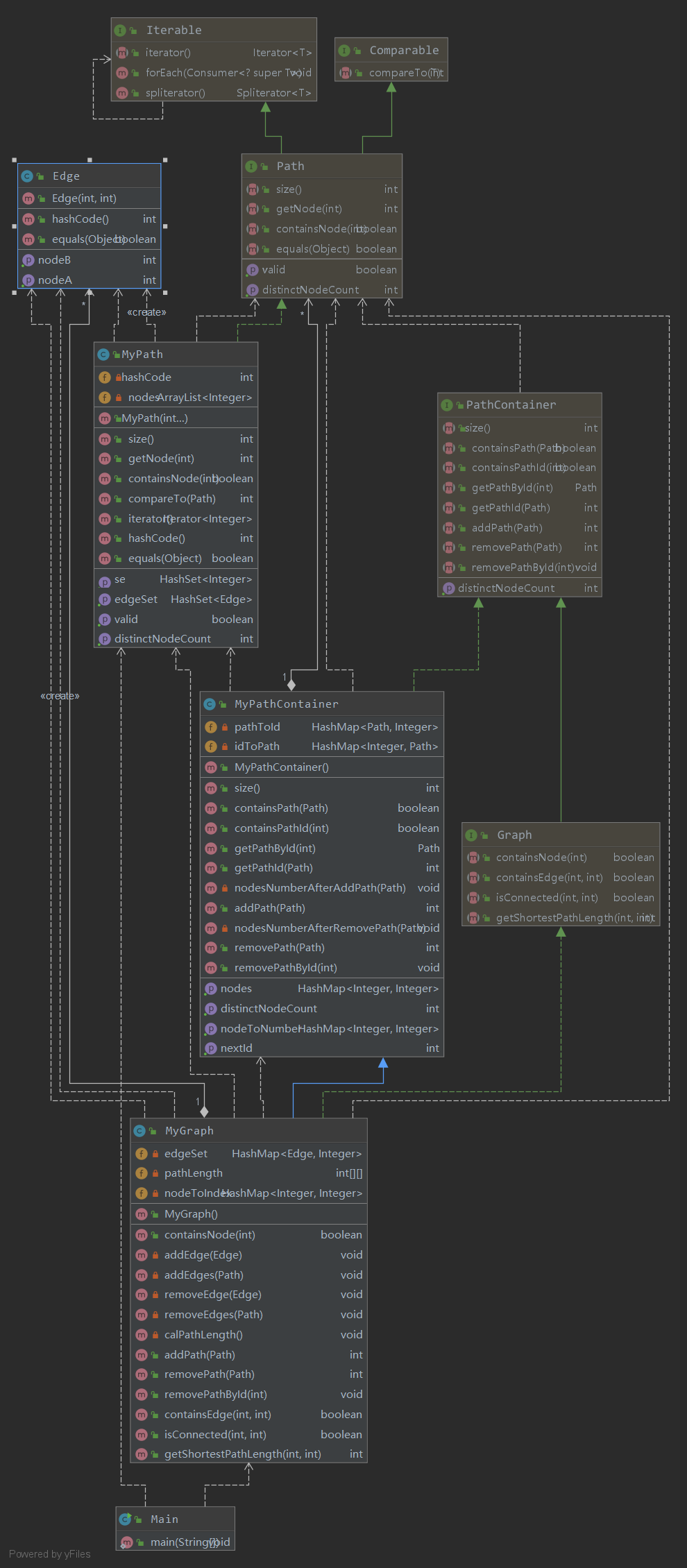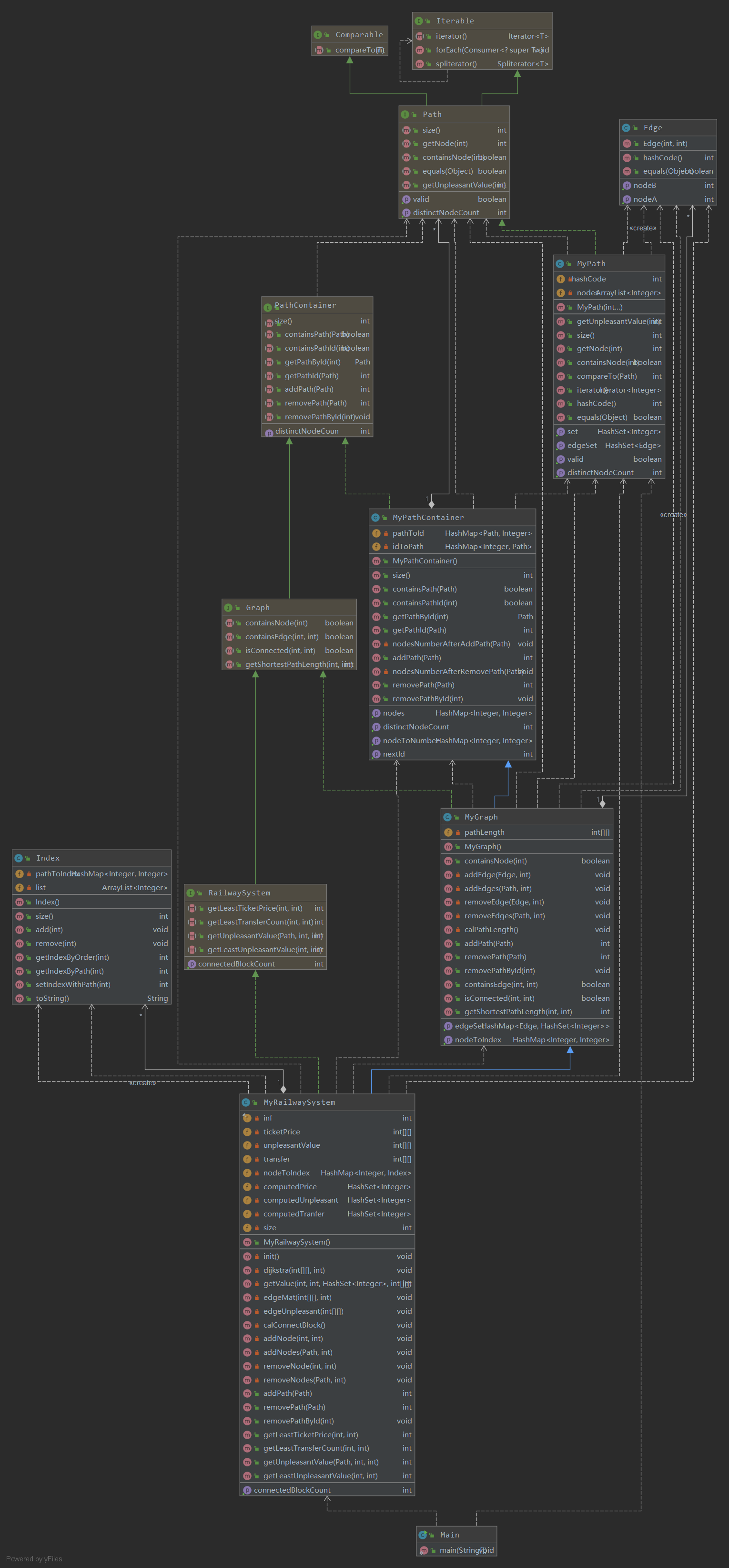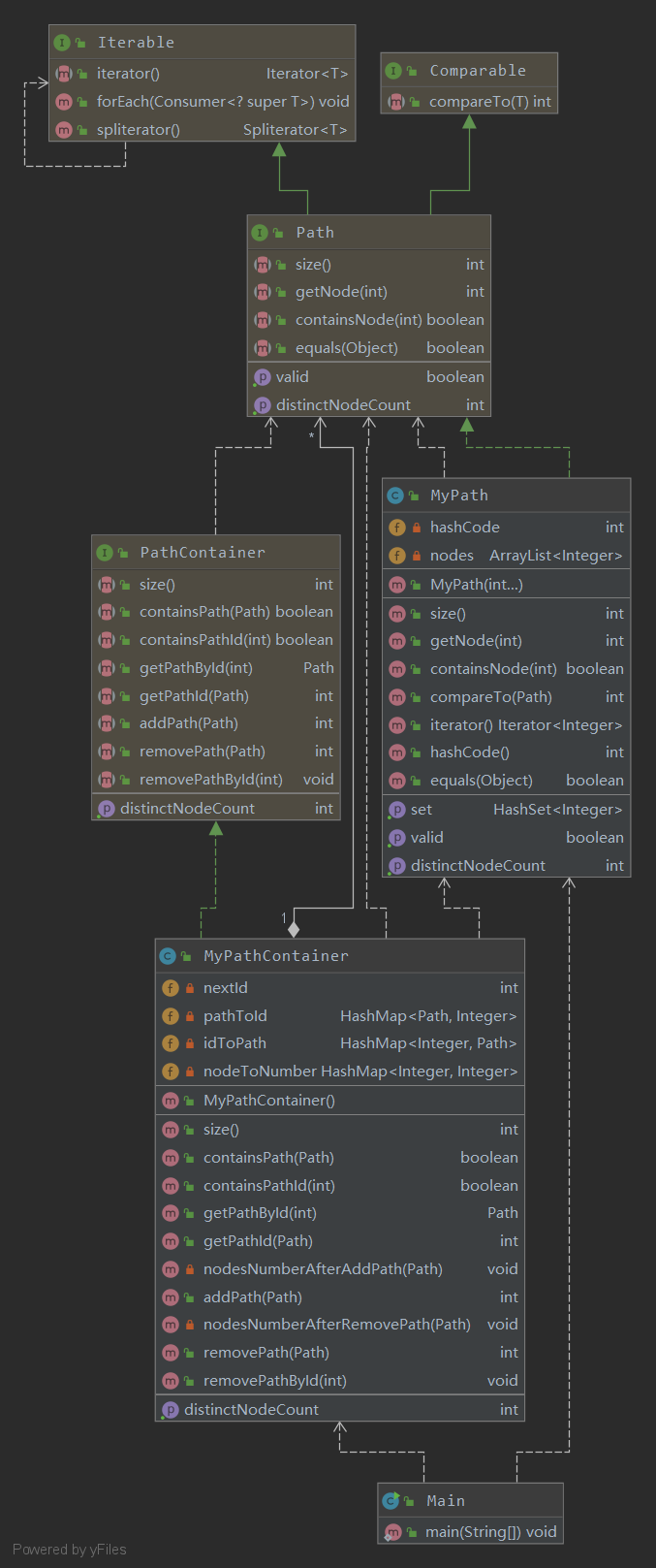 第一次作业比较简单,并没有什么需要架构设计的东西,完成两个需要的类就好了,其中MyPathContainer为了查找性能的提升,我加入了两个HashMap,PathId和Path的相互映射,使得getPathById和getPathId速度能够快一点,而且还加入了nodeToNumber的HashMap,来保存容器内有多少个不同的点。
