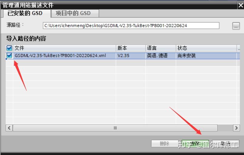 查看要添加的 GSD 文件的状态,是否为“尚未安装”,若是尚未安装,勾选 GSD 文件 前边的方框,点击“安装”;若是已安装,则可点击“取消”,跳过安装步骤,继续向下操作;