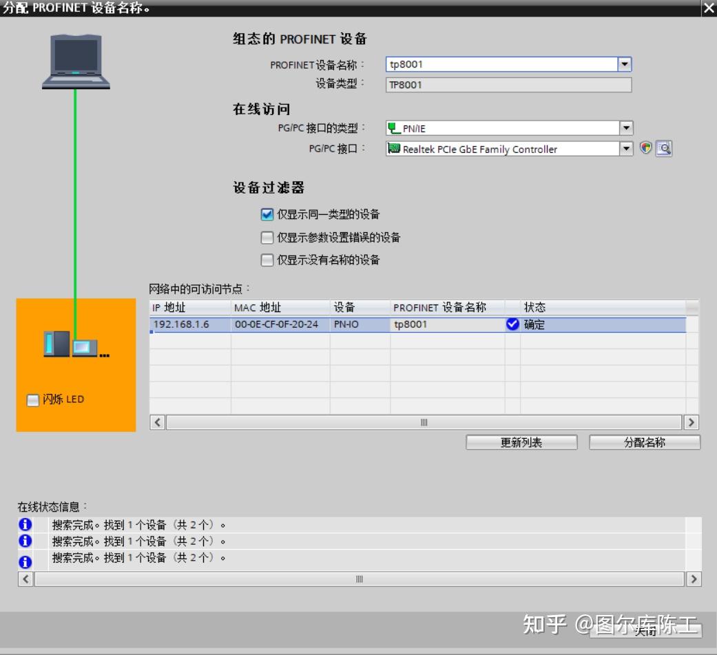 点击“PROFINET 设备名称”后边的下拉菜单,选择前边已分配的设备的名称,“PG/PC 接口的类型”选择“PN/IE”;“PG/PC 接口”选择自己的网络设备器;点击“更新列表”,查看“网络中的可访问节点”中,节点的状态是否为“确定”。若不是,选择该节点,点击下方的“分配名称”完成分配设备名称,点击“关闭”,关闭该页面;