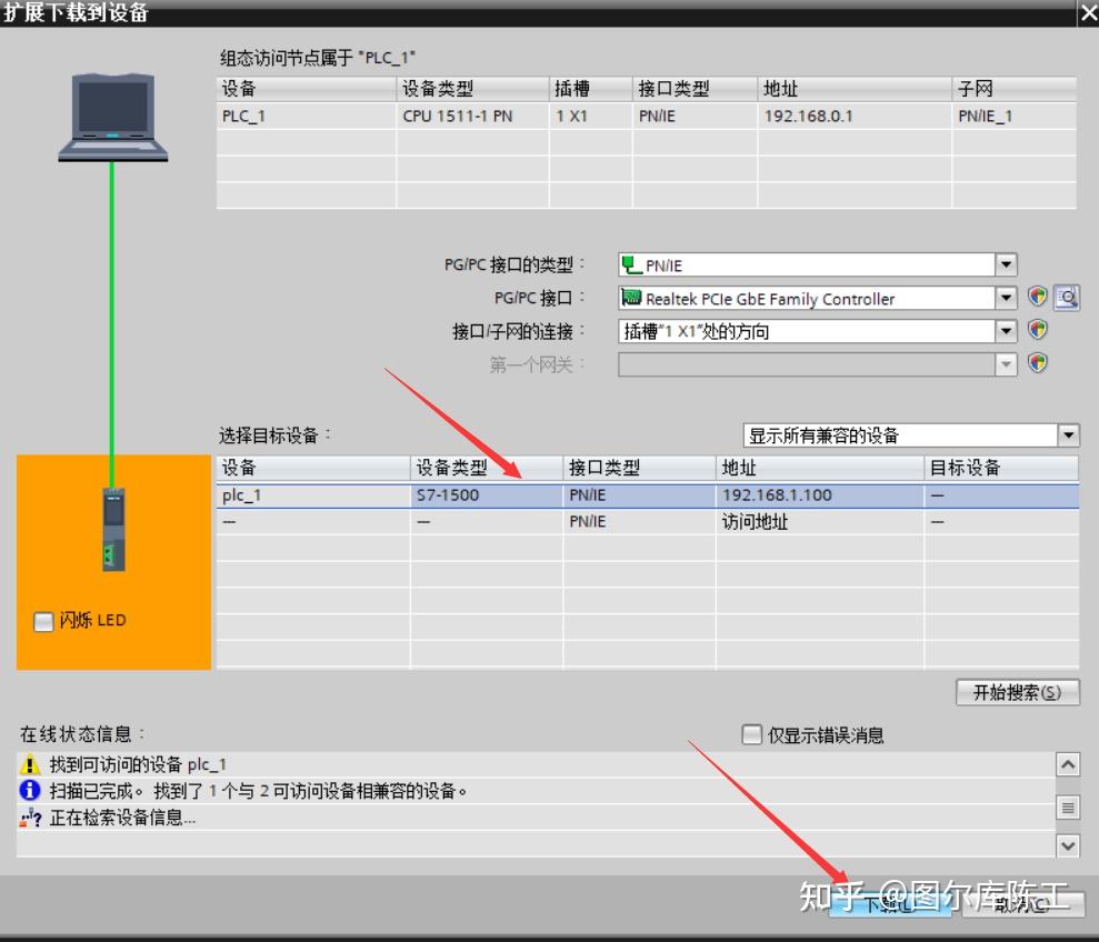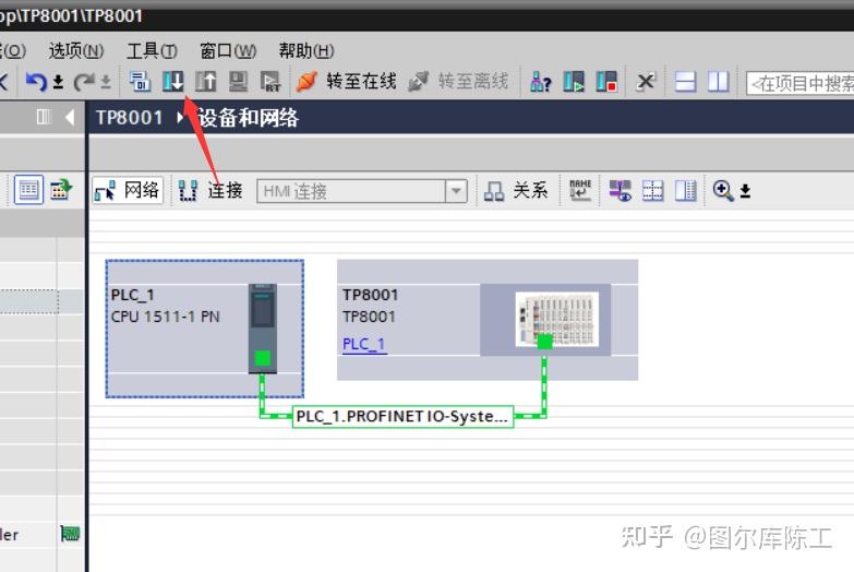 双击“设备和网络”,回至“网络视图”中,选择 PLC 后,点击菜单栏中的“下载到设备”按钮,将当前组态下载到 PLC 中;