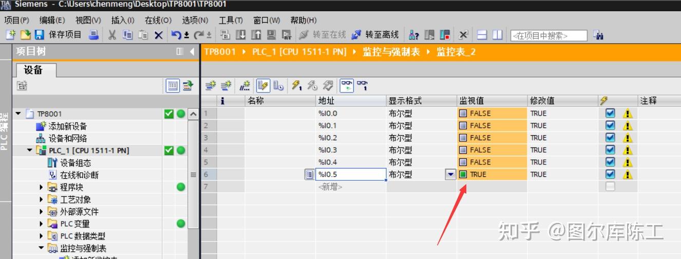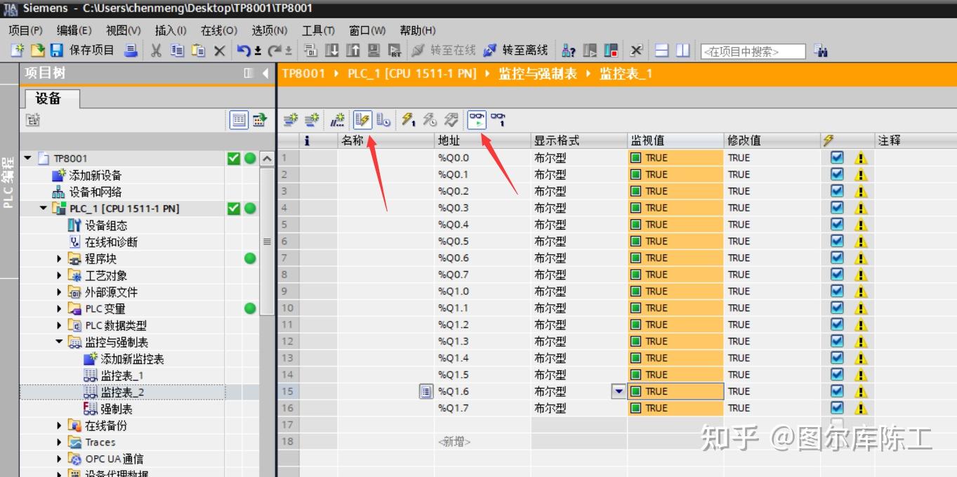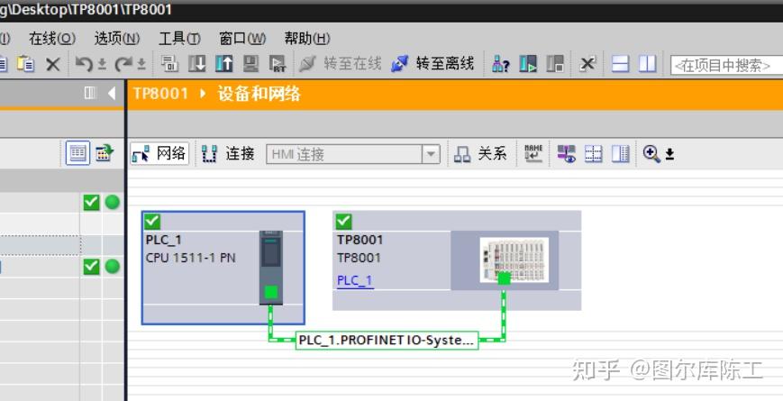 选择 PLC,点击菜单栏中的“转至在线”,如下图所示全为绿色极为连接成功;