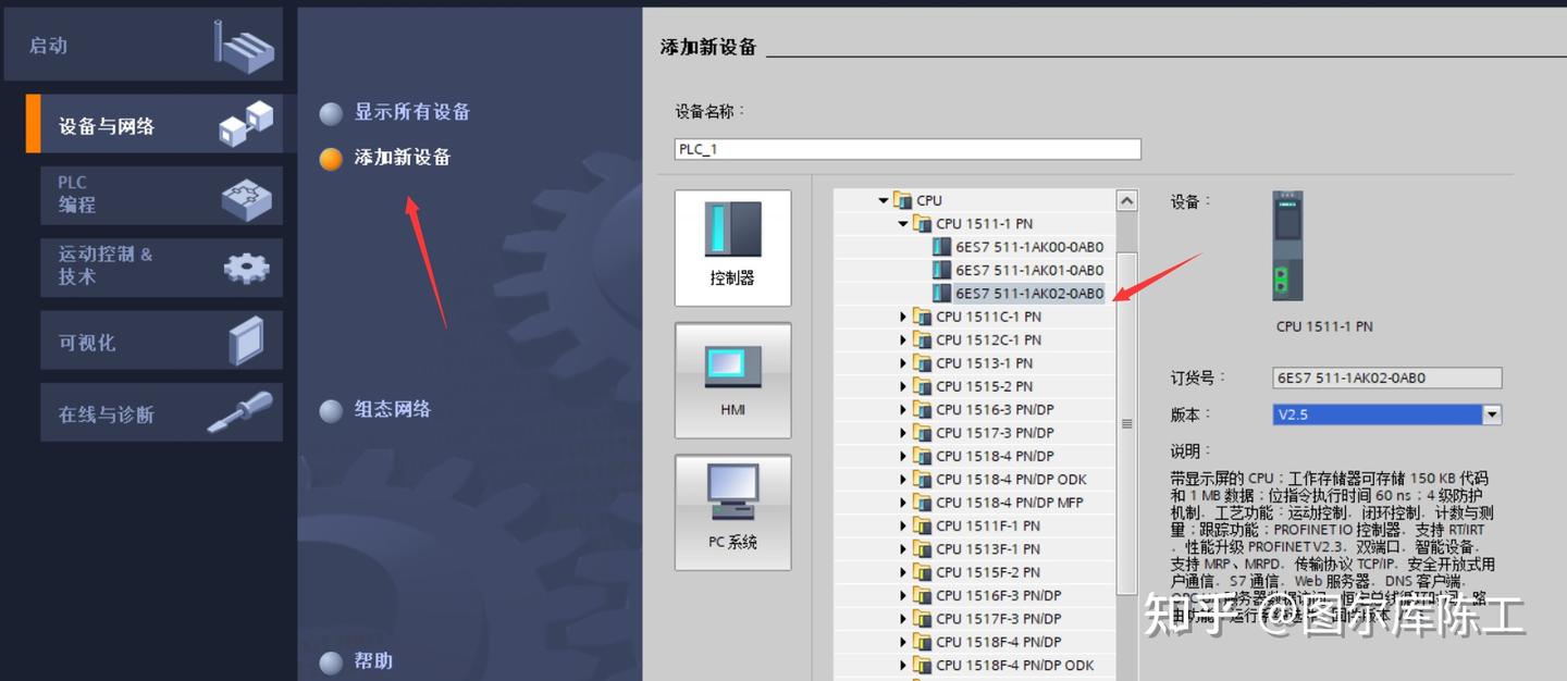 (3)在“设备与网络”中,点击“添加新设备”,选择“控制器”,选择当前所使用的 PLC 型号,点击“添加”,完成添加控制器操作;